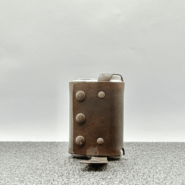 Each sleeve is crafted from vegetable-tanned, full-grain leather and hand-dyed for rich tone and texture. The leather is molded from a single piece with no stitching required. Over time, it develops a natural patina that reflects its use. The result is a rugged, timeless aesthetic that pairs beautifully with the Tinymight’s wood and metal elements.