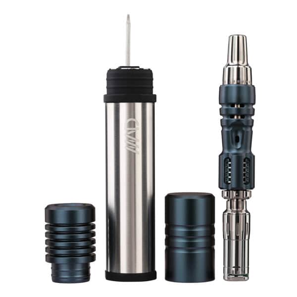 - Silicone-lined stainless steel case with an aluminum cap and aluminum herb storage.