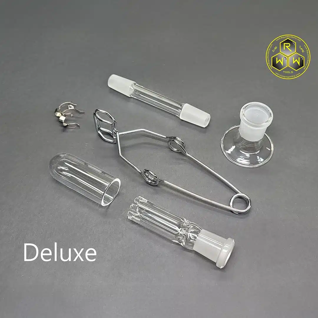 The Super Dope Kit includes a large stand and tongs in addition to the heater, bowl, connector, and keck clip. This makes it more stable, easier to handle, and better suited for extended use.