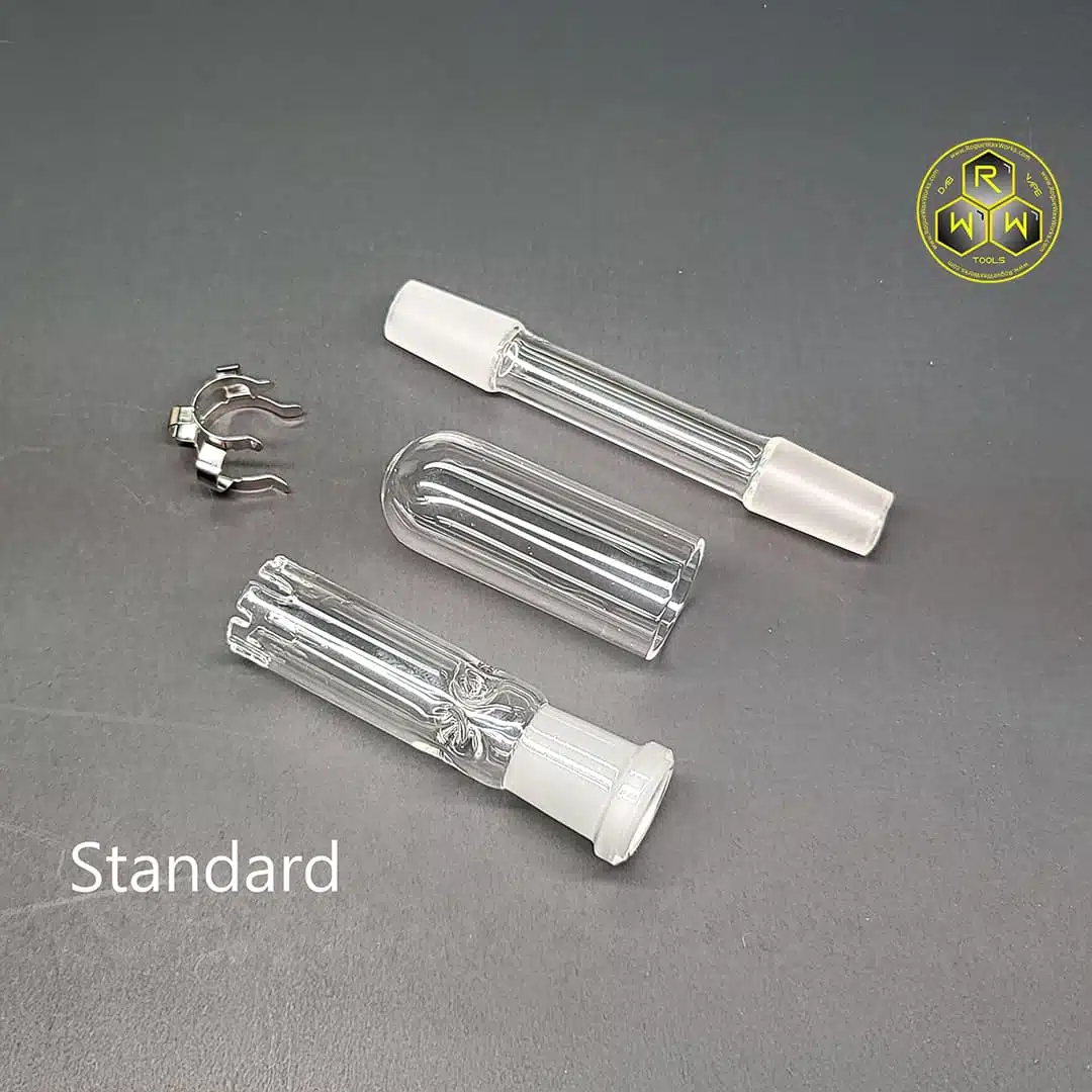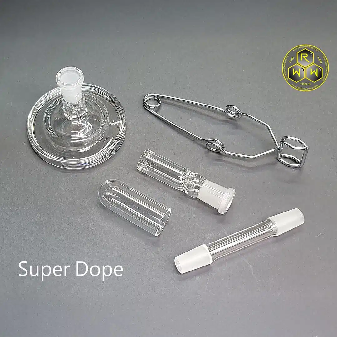 Heating Method Conduction + convection hybrid Heater Material Quartz Bowl Material Quartz Connector 14mm Fitting Kit Type Super Dope Build Quality Quartz with reinforced fittings What makes the Super Dope Kit different from the Standard or Deluxe Kit?